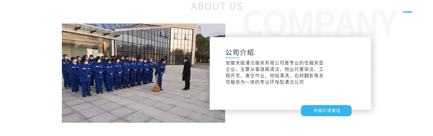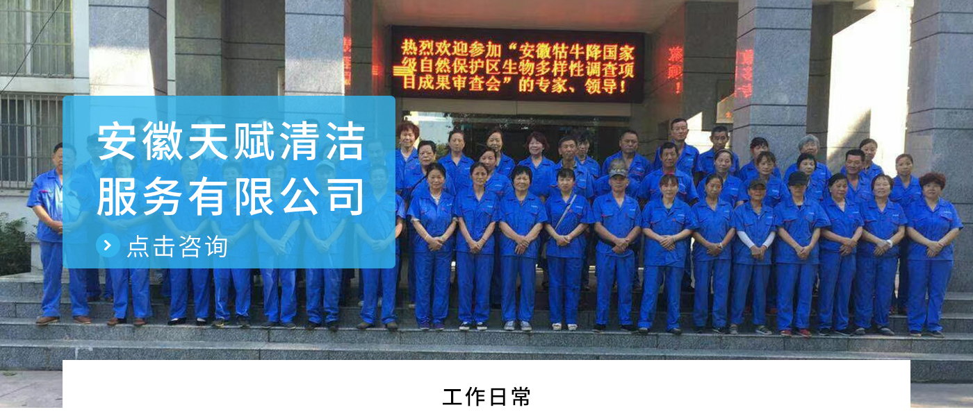 安徽天賦清潔服務有限公司是的服務型企業,主要從事道路清潔、物業托管保潔、工程開荒、高空作業、地毯清洗、石材翻新等多項服務為一體的環保型清潔公司。公司管理機制完善,清潔作業經驗豐富,擁有技術力量,嚴格實行崗前培訓—崗中督查—上崗在培訓的員工管理措施,憑著優良的清潔質量和嚴格的督查管理,為眾多企事業單位、醫院、酒店、廠區商場、物業、道路、學校、公園等提供后勤清潔服務。在業內擁有良好的口碑。工作人員,服務態度優,竭力為客戶提供好的保潔服務。安徽天賦清潔服務有限公司:致力于長期合作關系,提高服務質量,提供高標準的清潔服務。公司的經營理念:為營造一個更清潔、亮麗的生活和工作環境而努力!“誠信”是公司成功保證?!翱蛻糁辽希抛u為首”是公司宗旨。高標準提供服務,維護客戶利益、形象,是我始終不渝的目標。